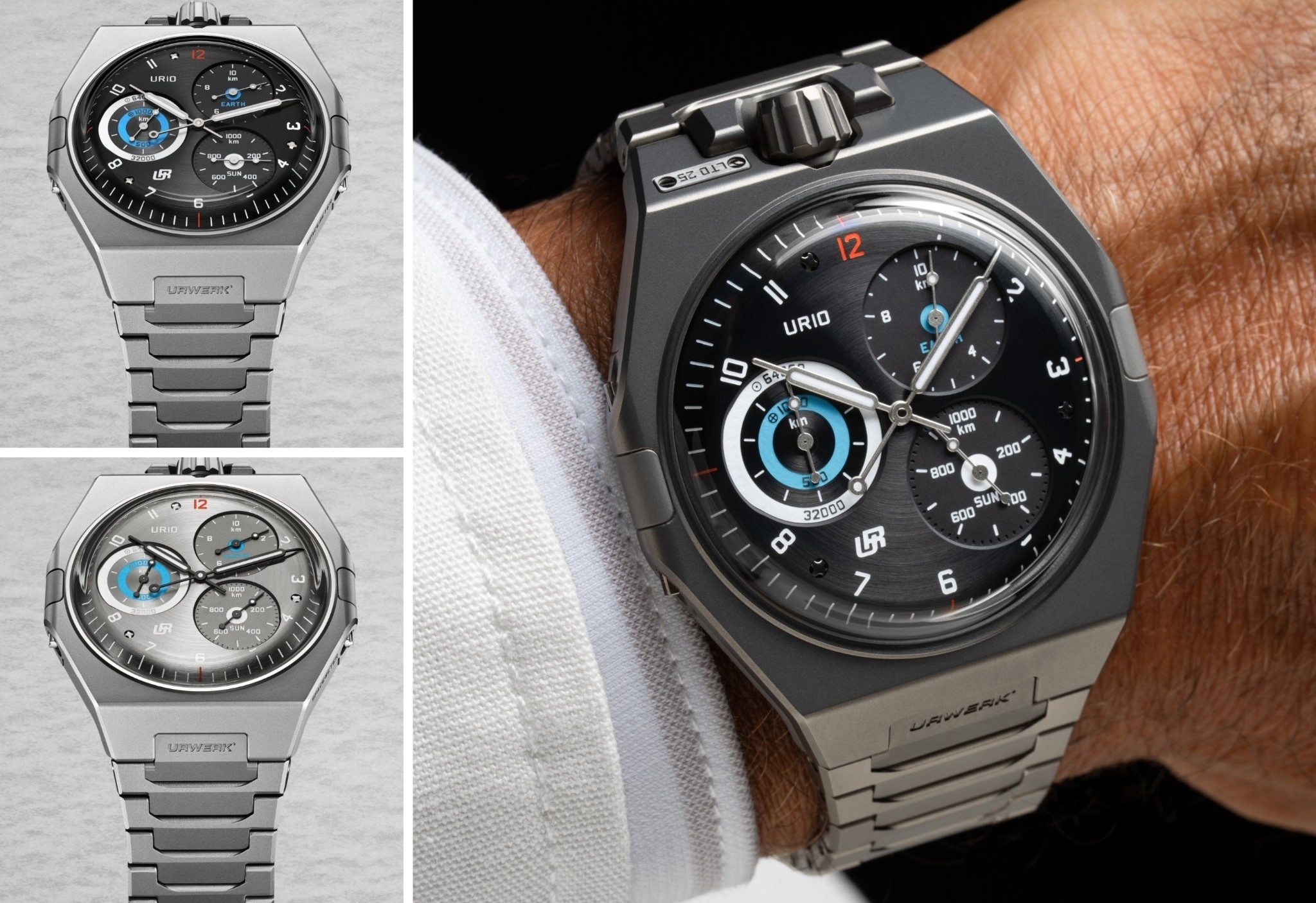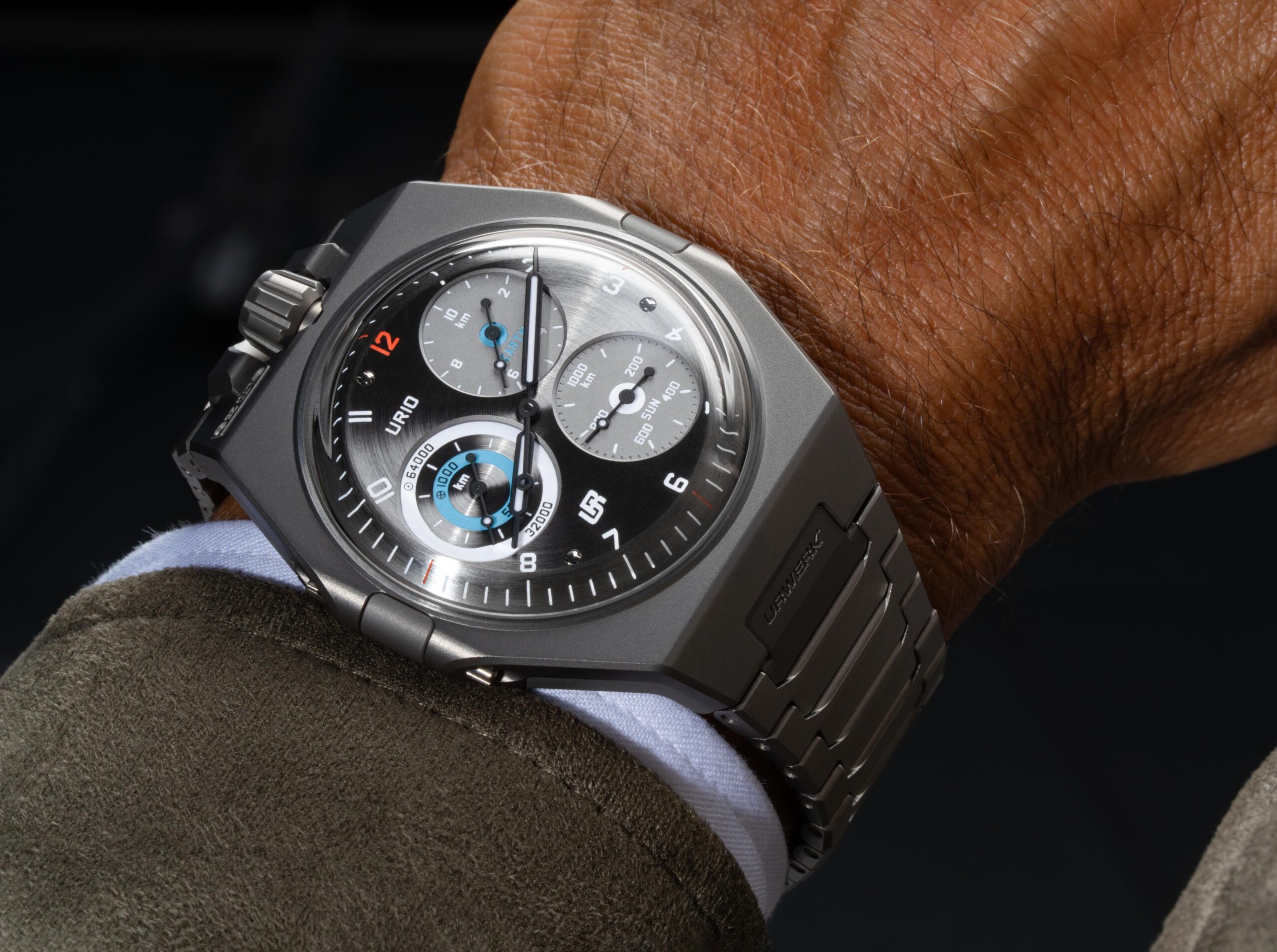 R-10 là một trong số ít thiết kế của URWERK buộc ánh nhìn phải dừng lại ở mặt số lâu hơn trước khi chú ý đến những yếu tố khác. Bởi lẽ, mặt số tròn cùng kim trung tâm tạo cảm giác quen thuộc, nhưng chính sự quen thuộc ấy lại mở ra một hệ hiển thị chưa từng xuất hiện trong đồng hồ cơ trước đây.UR-10 không phải regulator, cũng không phải chronograph hay đồng hồ lịch. Ngay từ mặt số, URWERK đã làm rõ điều đó khi ba mặt số phụ không đo thời gian trôi qua, mà ghi nhận quãng đường Trái Đất di chuyển trong không gian. Ở vị trí 2 giờ, thang EARTH theo dõi chuyển động tự quay của Trái Đất theo đơn vị kilomet. Ở vị trí 4 giờ, thang SUN ghi lại quãng đường hành tinh di chuyển trên quỹ đạo quanh Mặt Trời. Trong khi đó, thang ORBIT tại vị trí 9 giờ kết hợp cả hai chuyển động trên những thang đo được đồng bộ hóa. Để giúp người đeo tiếp cận hệ hiển thị khác thường này một cách tự nhiên, UR-10 sử dụng mặt số tròn cùng kim trung tâm như một điểm neo thị giác quen thuộc. Toàn bộ kim và các đĩa hiển thị được chế tác hoàn toàn nội bộ, cho phép URWERK kiểm soát chặt chẽ tỷ lệ, bố cục và độ hoàn thiện. Thông qua hệ hiển thị không dựa trên chuẩn mực truyền thống, sự chính xác trong từng chi tiết là yếu tố then chốt để đảm bảo tính mạch lạc cùng khả năng đọc.