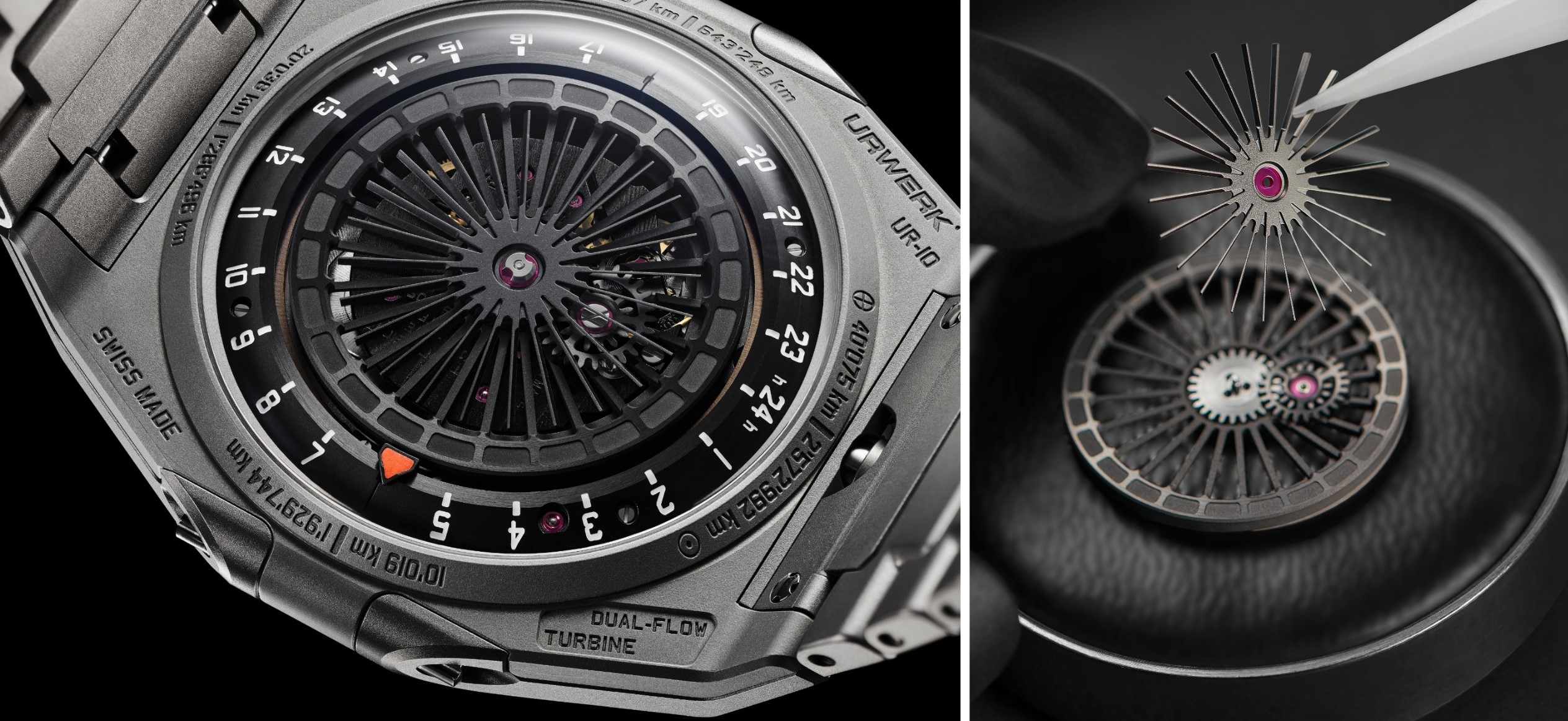 Cấu trúc vỏ mỏng bảo vệ những phát triển kỹ thuật quen thuộc của URWERK, được điều chỉnh để phù hợp với dự án UR-10, Calibre UR-10.01. Trữ 43 giờ năng lượng, bộ máy tự động với hai thùng cót được thiết kế để đáp ứng nhu cầu năng lượng ổn định của hệ hiển thị SpaceMeter, đồng thời tích hợp hệ thống Dual Flow Turbines được cấp bằng sáng chế. Hai cánh turbine quay ngược chiều nhau giúp kiểm soát tốc độ rotor trong cơ chế lên cót một chiều, đặc biệt khi rotor quay nhanh nhưng không tham gia quá trình nạp năng lượng. Nhờ luồng khí hình thành giữa các cánh turbine, chuyển động được hãm lại một cách chủ động, giảm tải cơ học và bảo vệ toàn bộ hệ thống bên trong.