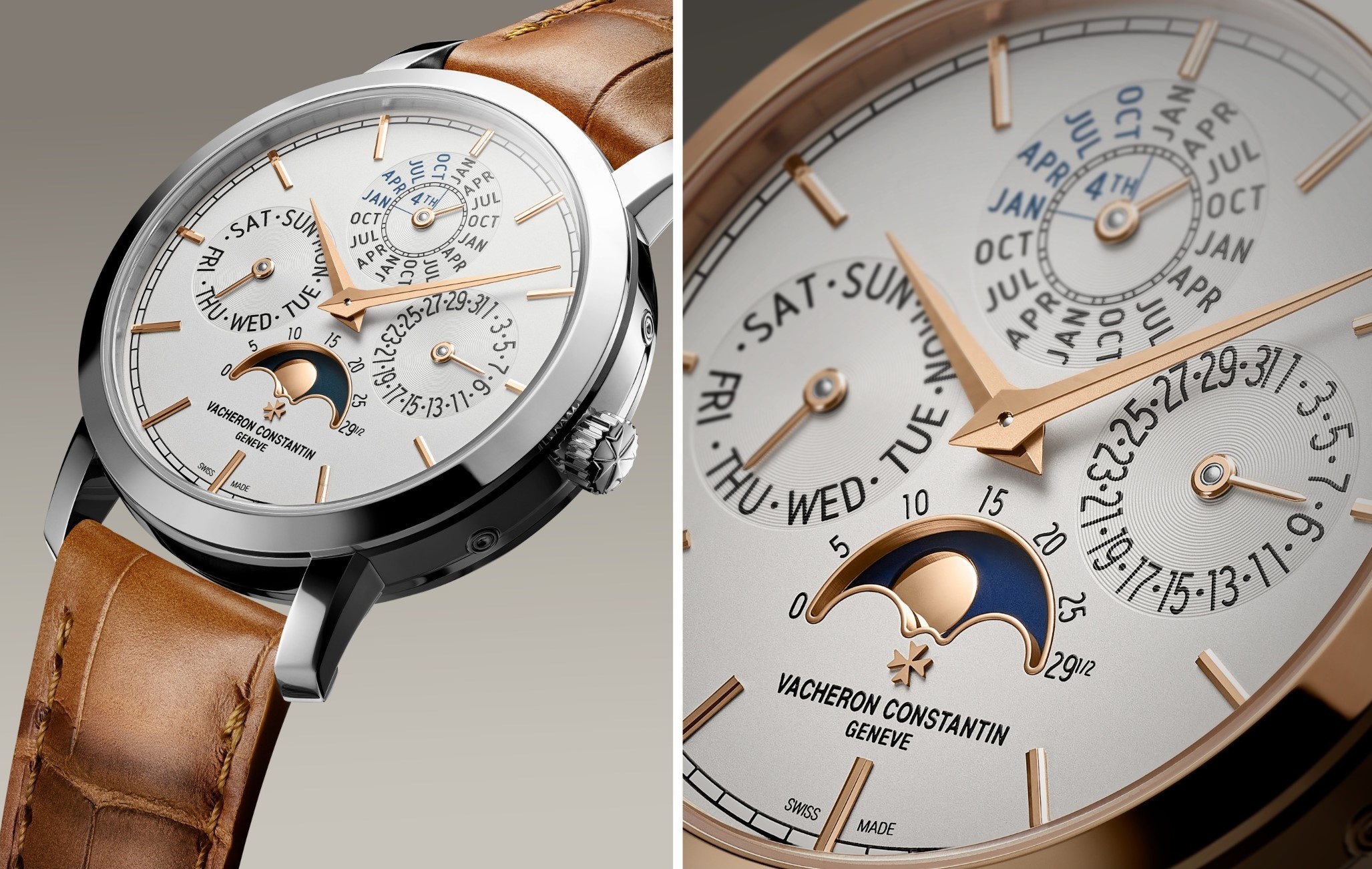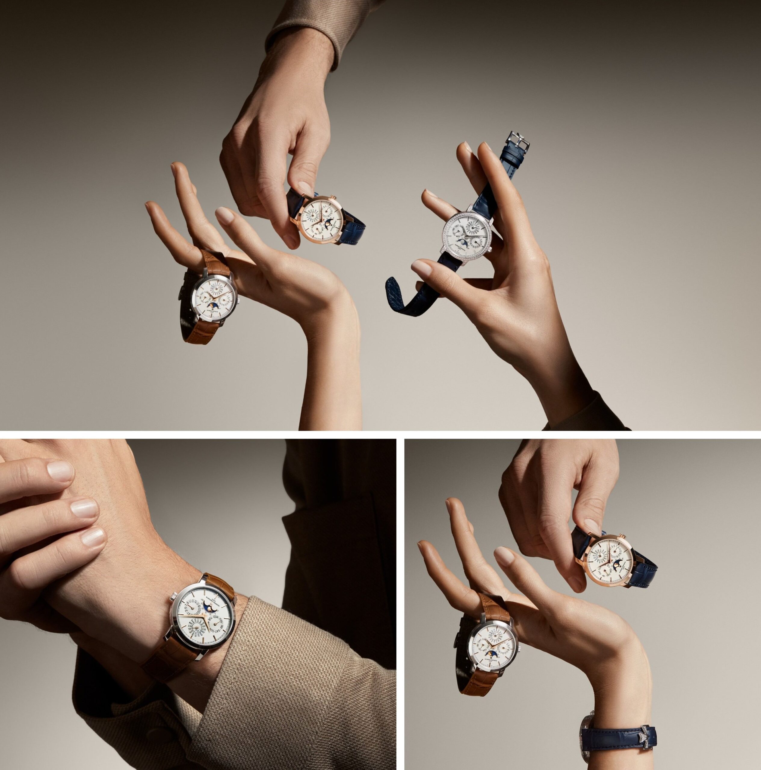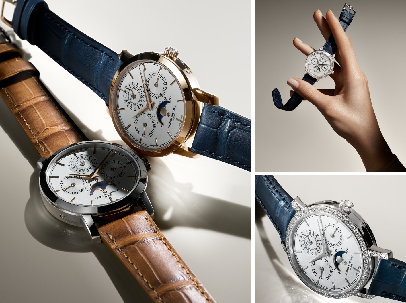 Đầu tiên, phiên bản vàng hồng 18K 5N kiến tạo sắc thái đồng điệu với kim Dauphine cùng bộ cọc số baton đồng màu, kết hợp nền moonphase xanh đậm, dây da cá sấu xanh ton-sur-ton. Trong khi đó, phiên bản vàng trắng 18K nổi bật nhờ tính tương phản nhẹ, khi kim Dauphine cùng cọc số baton vàng hồng, phối nền moonphase xanh nhạt hơn cùng dây da cá sấu nâu sáng. Cuối cùng, phiên bản vàng trắng nạm đá tạo khác biệt với vành gờ, vấu, núm vặn điểm xuyết kim cương rực rỡ, tương thích mặt số opaline bạc và dây da cá sấu xanh đậm.