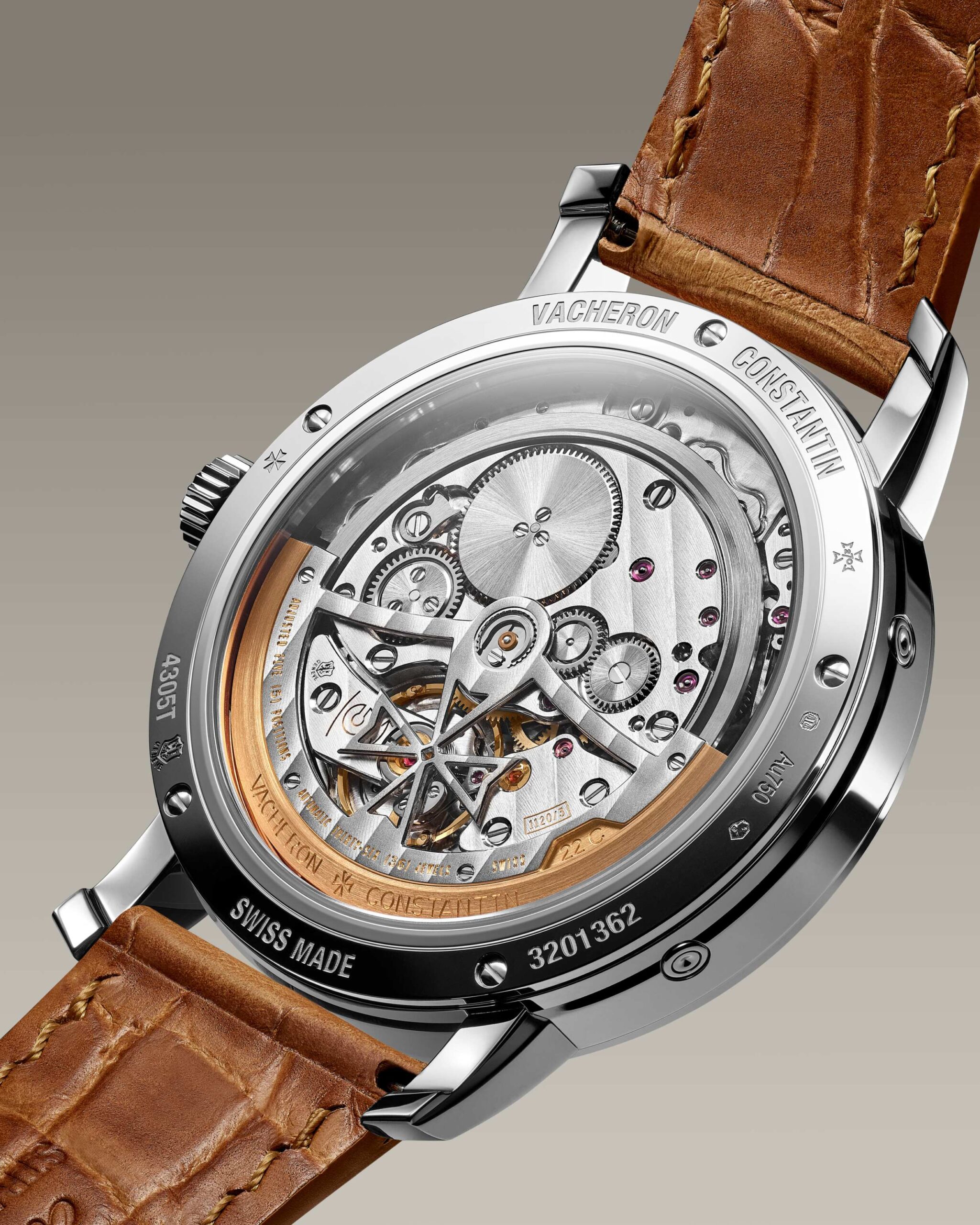 Trung tâm điều phối mọi hoạt động chính xác, Calibre 1120 QP, xứng đáng với danh xưng “biểu tượng kỹ nghệ đỉnh cao của Vacheron Constantin trong lĩnh vực đồng hồ siêu mỏng”. Với 276 linh kiện sắp xếp vừa vặn trong độ dày 4,05mm, bộ máy tự động đảm bảo cơ chế lịch vạn niên, từ ngày, thứ, tháng, năm nhuận đến chu kỳ trăng và tuổi trăng, vận hành chính xác đến năm 2100 mà không cần điều chỉnh thủ công. Đặc biệt, “trái tim cơ học” còn trở thành tâm điểm khi mặt sau bằng sapphire trong suốt, với cầu nối điểm vân Côtes de Genève, cạnh vát thủ công, vít chải xước tròn và rotor có phần viền bằng vàng 22K thiết kế skeleton theo hình thập tự giá Maltese đặc trưng của thương hiệu.