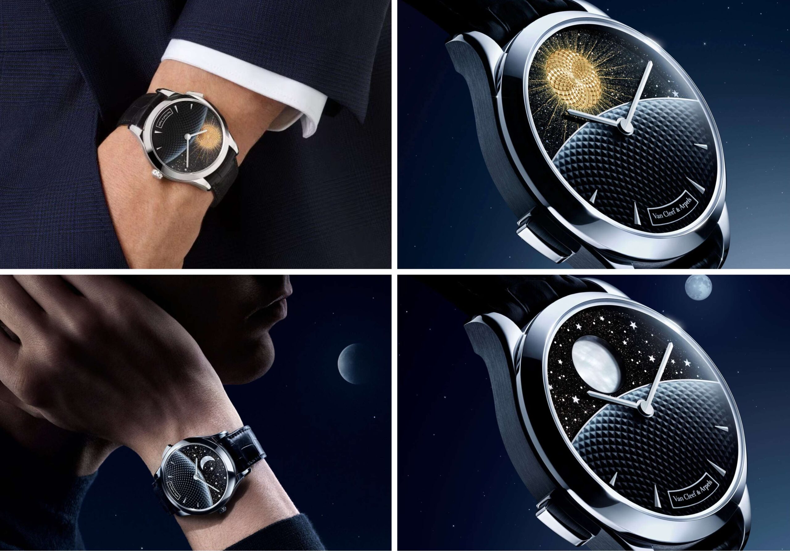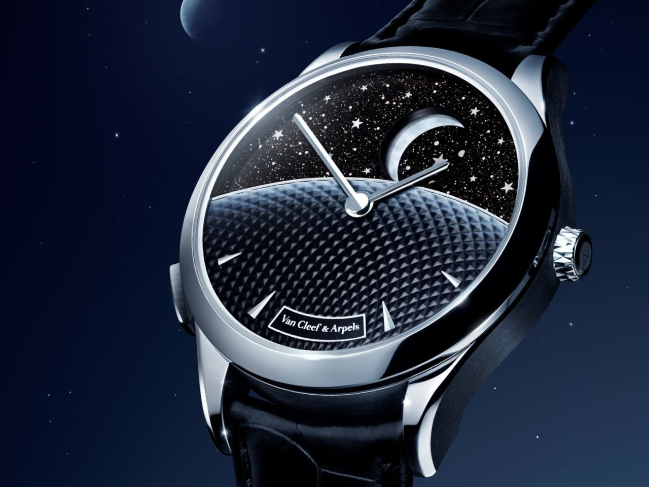 iền chặt bởi vỏ Midnight vàng trắng 42mm, mặt số bừng sáng với vẻ lấp lánh mãnh liệt của thủy tinh aventurine Murano đen gợi nhắc trọn vẹn vẻ đẹp của bầu trời đêm – thành quả nghiên cứu và phát triển của bộ phận Van Cleef & Arpels Innovation Department. Trong suốt hành trình của một ngày, Mặt Trời bằng vàng guilloché dần nhường chỗ cho Mặt Trăng bằng xà cừ trắng, bao quanh bởi những vì sao viền acrylic. Hai thiên thể lần lượt hiện ra rồi khuất đi sau đường chân trời, được biểu đạt bằng một lớp xà cừ guilloché chuyển sắc từ đen sang trắng. Cuộc đuổi bắt hằng ngày ấy vận hành bằng đĩa xoay 24 giờ – dấu ấn đặc trưng của những thiết kế Jour Nuit. Phần cơ chế hiển thị đầu tiên tiếp tục được nâng tầm bằng sự biến chuyển tinh tế trong diện mạo của Mặt Trăng, cộng hưởng cùng chu kỳ vĩnh hằng kéo dài 29,5 ngày. Hiện tượng thiên văn đẹp mắt này vẫn có thể được kích hoạt theo yêu cầu qua nút bấm ngụ cạnh vỏ ngay cả khi Mặt Trăng đang ẩn sau lớp màn. Khi khởi động hoạt cảnh, mặt số sẽ ngay lập tức quay tròn 360° trong khoảng 10 giây, hé lộ “vệ tinh” của Trái Đất trong khung cảnh đầy sao.