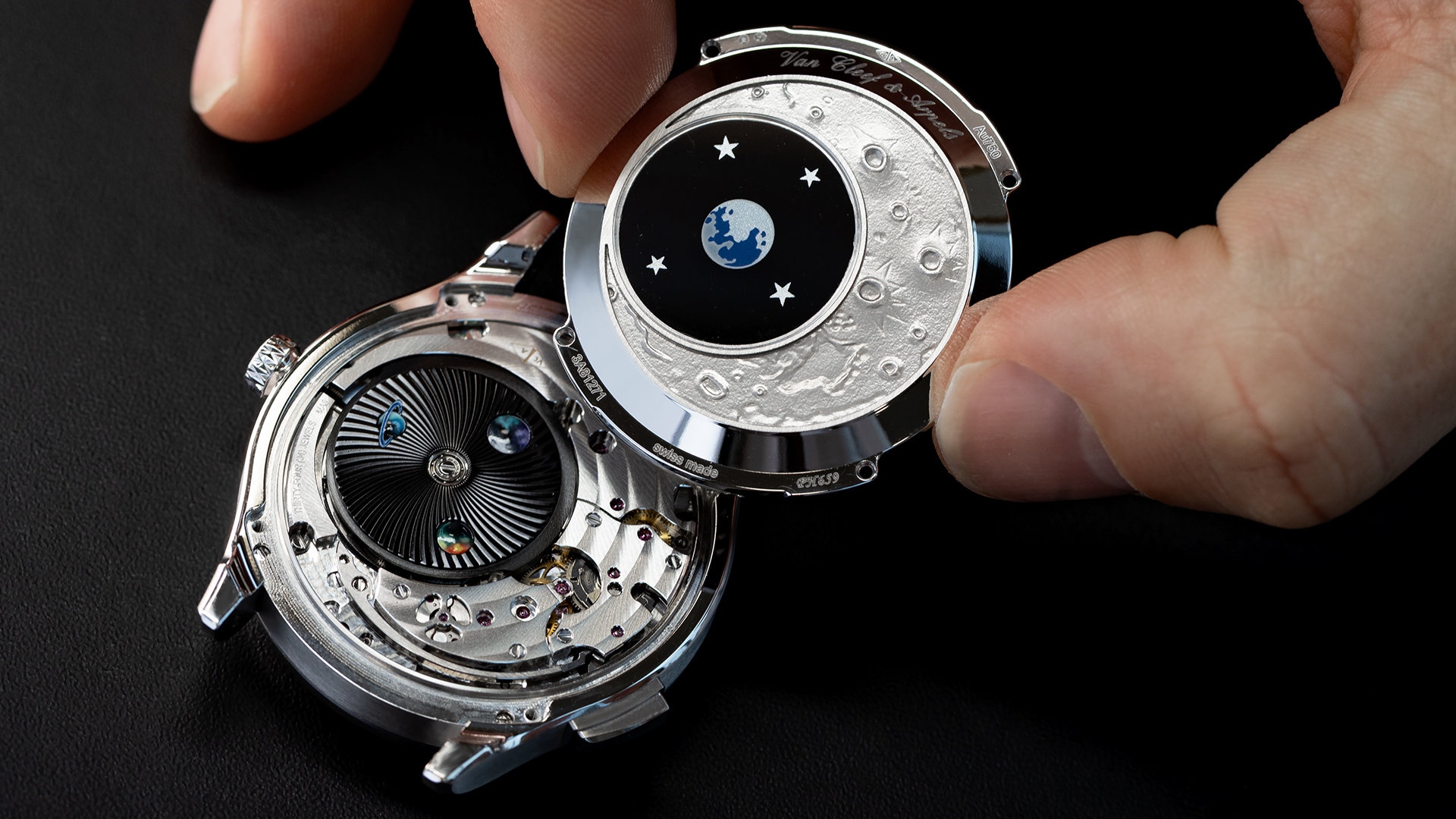 Câu chuyện đầy thi vị còn tiếp tục ở phần mặt sau với hình khắc trên nền chất liệu vàng trắng gợi tả bề mặt Mặt Trăng. Trái Đất được thể hiện bằng đường viền tráng men trên mặt kính sapphire đặt phía trên rotor quay. Lớp kính sapphire này cũng điểm xuyết các hành tinh được thực hiện bằng nghệ thuật vi tả, lấp lánh dịu dàng trên nền guilloché. Nắp lưng của mẫu đồng hồ có góc nhìn đảo ngược so với mặt số, miêu tả vũ trụ không phải từ Trái Đất mà từ chính Mặt Trăng.