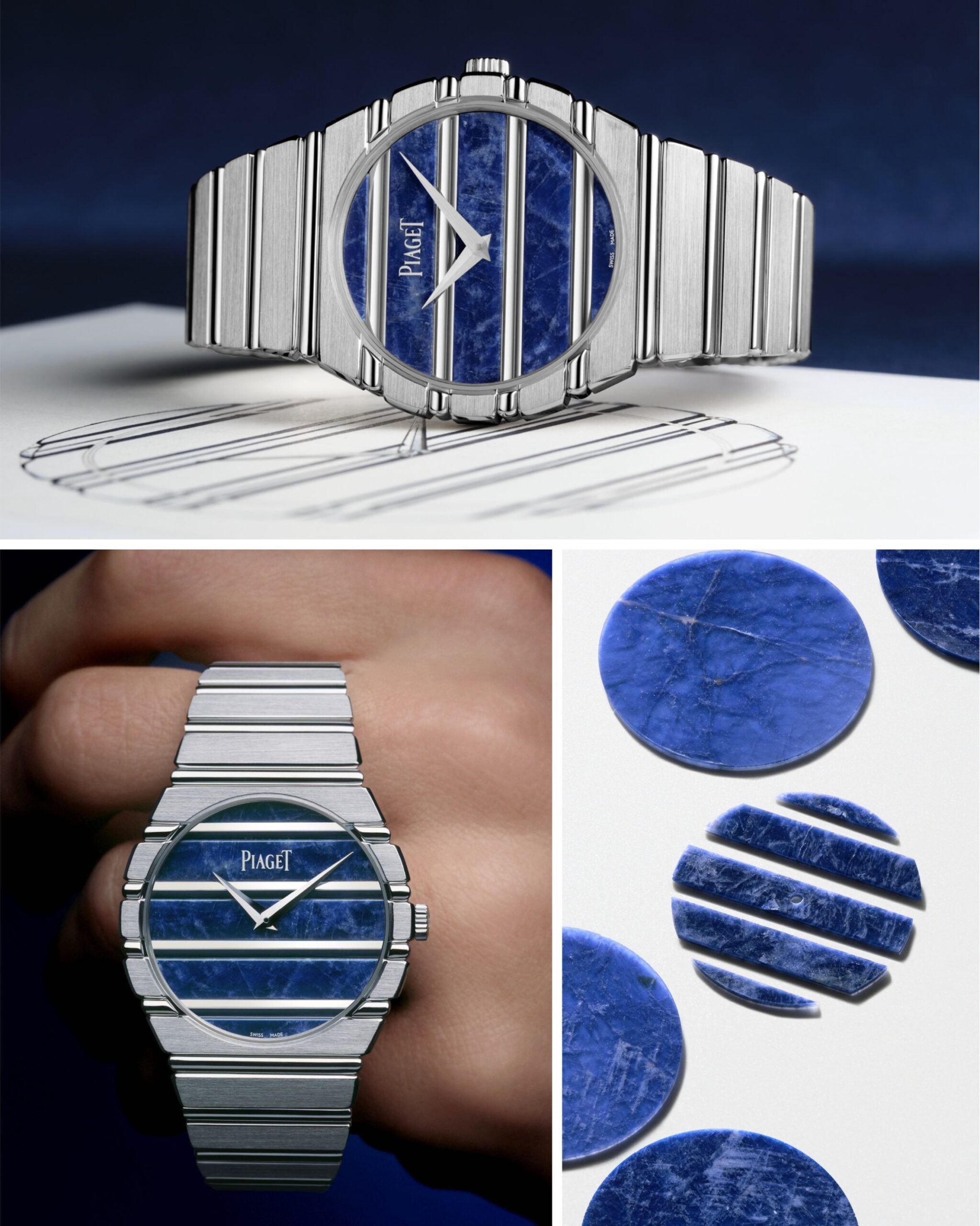 Vỏ 38 mm và dây tích hợp đều bằng vàng trắng 18k, kết hợp cùng mặt số sodalite xanh đậm và các đường gadroon bóng. Tổng thể giữ nguyên kiến trúc đặc trưng của Polo nhưng cho cảm giác mát hơn và hiện đại hơn so với bản vàng vàng. Bên trong là bộ máy tự động siêu mỏng 1200P với micro-rotor.