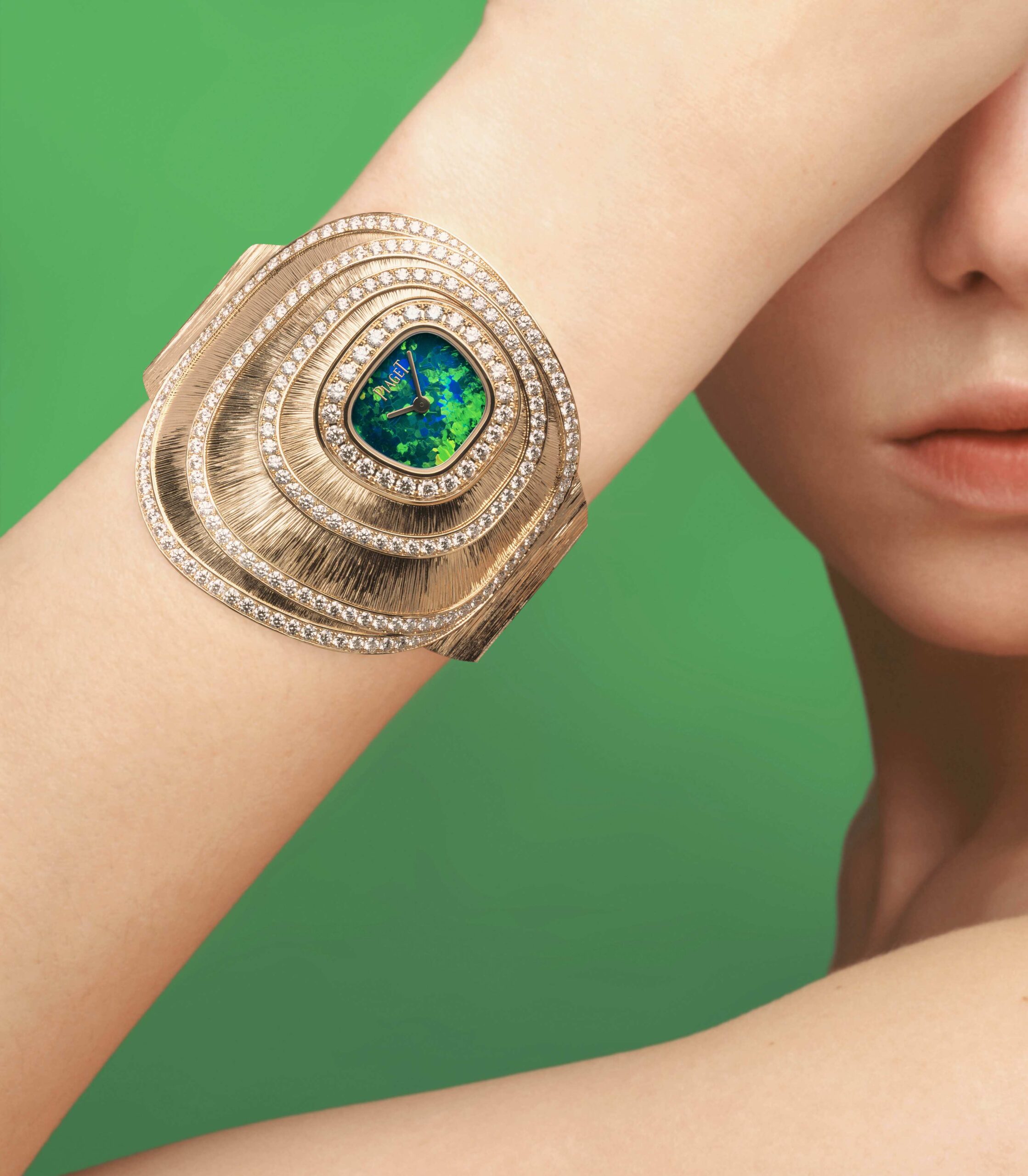Piaget tiếp tục nhắc lại truyền thống dùng mặt số đá màu trên các mẫu high jewelry với Sixtie High Jewelry Cuff. Thiết kế này đưa dáng vỏ hình thang mềm của dòng Sixtie vào cấu trúc cuff bằng vàng hồng.