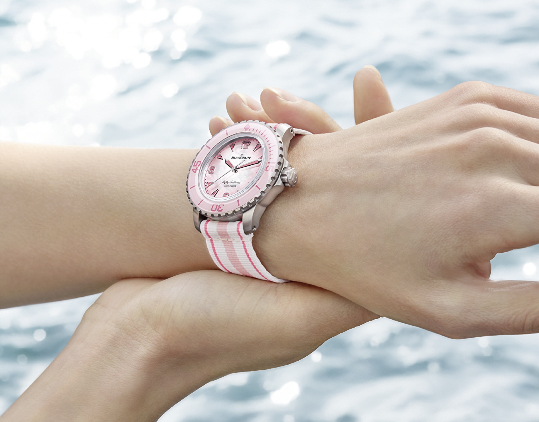 Phiên bản Fifty Fathoms Automatique hồng từ Blancpain có mặt đồng hồ được chế tác từ xà cừ tự nhiên, khoác lên mình sắc hồng lấp lánh, biến chuyển ánh sắc như mặt biển dưới nắng. Với đường kính 38.2 mm, chiếc đồng hồ sở hữu kích thước thanh thoát nhưng vẫn đủ mạnh mẽ để ghi dấu ấn. Vỏ đồng hồ làm từ titanium chải xước, mang tông xám dịu nhẹ, tương phản đầy nghệ thuật với vành bezel sapphire phát quang màu hồng ánh sáng. Ẩn bên trong là bộ máy tự động Caliber 1153 độc quyền của Blancpain, với khả năng dự trữ năng lượng lên tới 100 giờ, cùng dây tóc silicon kháng từ, minh chứng cho đỉnh cao cơ khí siêu mỏng. Dây đeo NATO bằng vải, phối màu trắng cùng sọc hồng pastel và hồng điện, vừa mềm mại vừa thể thao, khiến chiếc đồng hồ như một làn gió mới, rực rỡ và cá tính.