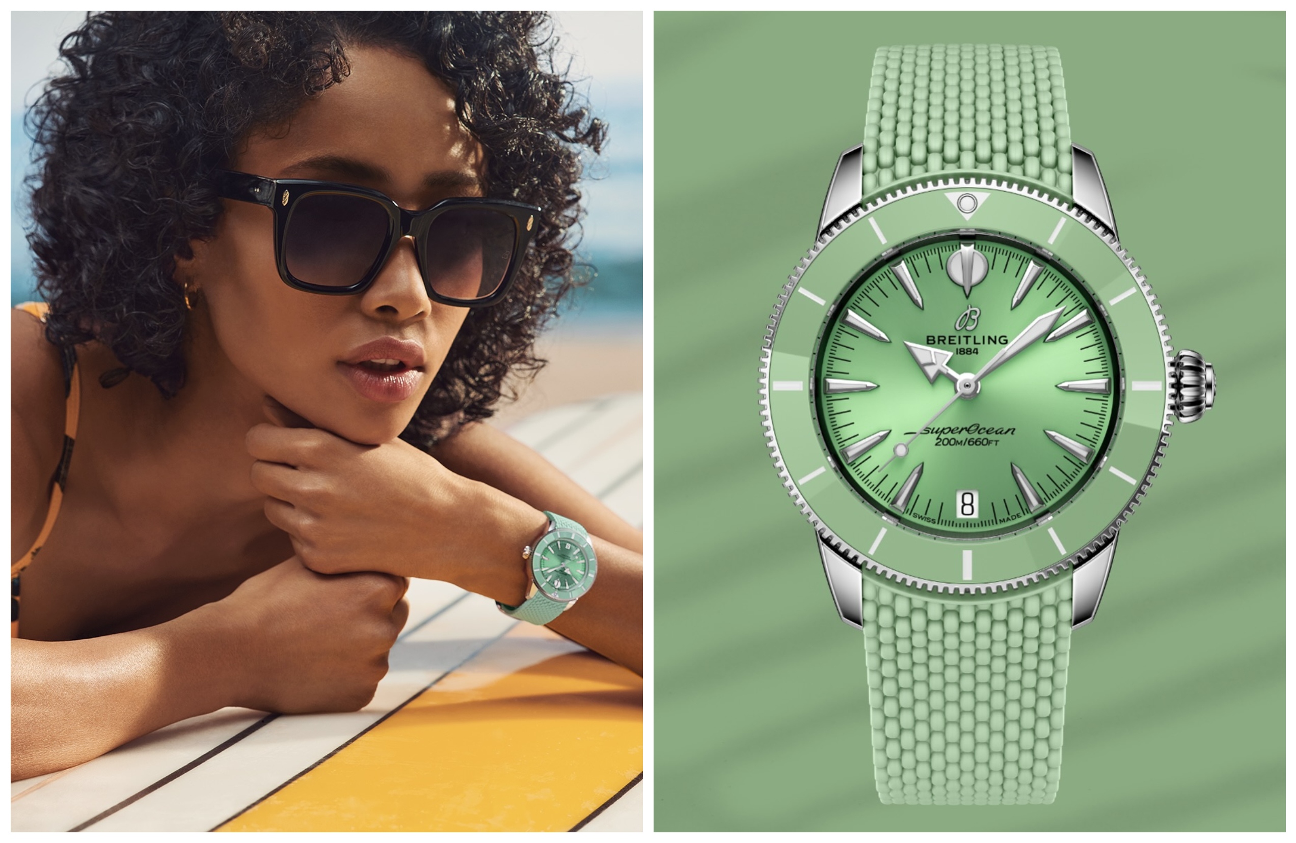 Superocean Heritage Automatic 36 từ Breitling là lời hồi đáp sang trọng dành cho những tâm hồn yêu biển và đam mê phong cách cổ điển. Mặt đồng hồ giữ nguyên ngôn ngữ thiết kế huyền thoại từ năm 1957 với kim chỉ giờ hình mũi tên và kim phút hình mũi giáo, nổi bật trên nền mặt số thanh thoát cùng cửa sổ lịch tại vị trí 6 giờ, tất cả được bảo vệ bởi lớp kính sapphire cong chống lóa hai mặt. Với kích thước 36 mm và độ dày chỉ 10.42 mm, thiết kế nhỏ gọn nhưng đầy đặn này mang đến cảm giác cân đối. Vỏ đồng hồ làm từ thép không gỉ cao cấp, kết hợp với vành bezel một chiều có lõi gốm tăng khả năng chống trầy xước tối ưu. Bộ máy cơ tự động Breitling Caliber 10 với 25 chân kính, tần số dao động 28.800 vph, cùng khả năng dự trữ năng lượng 42 giờ. Dây đeo cao su màu xanh lá được hoàn thiện với khoá gập bằng thép không gỉ, tạo nên điểm nhấn thể thao và năng động.