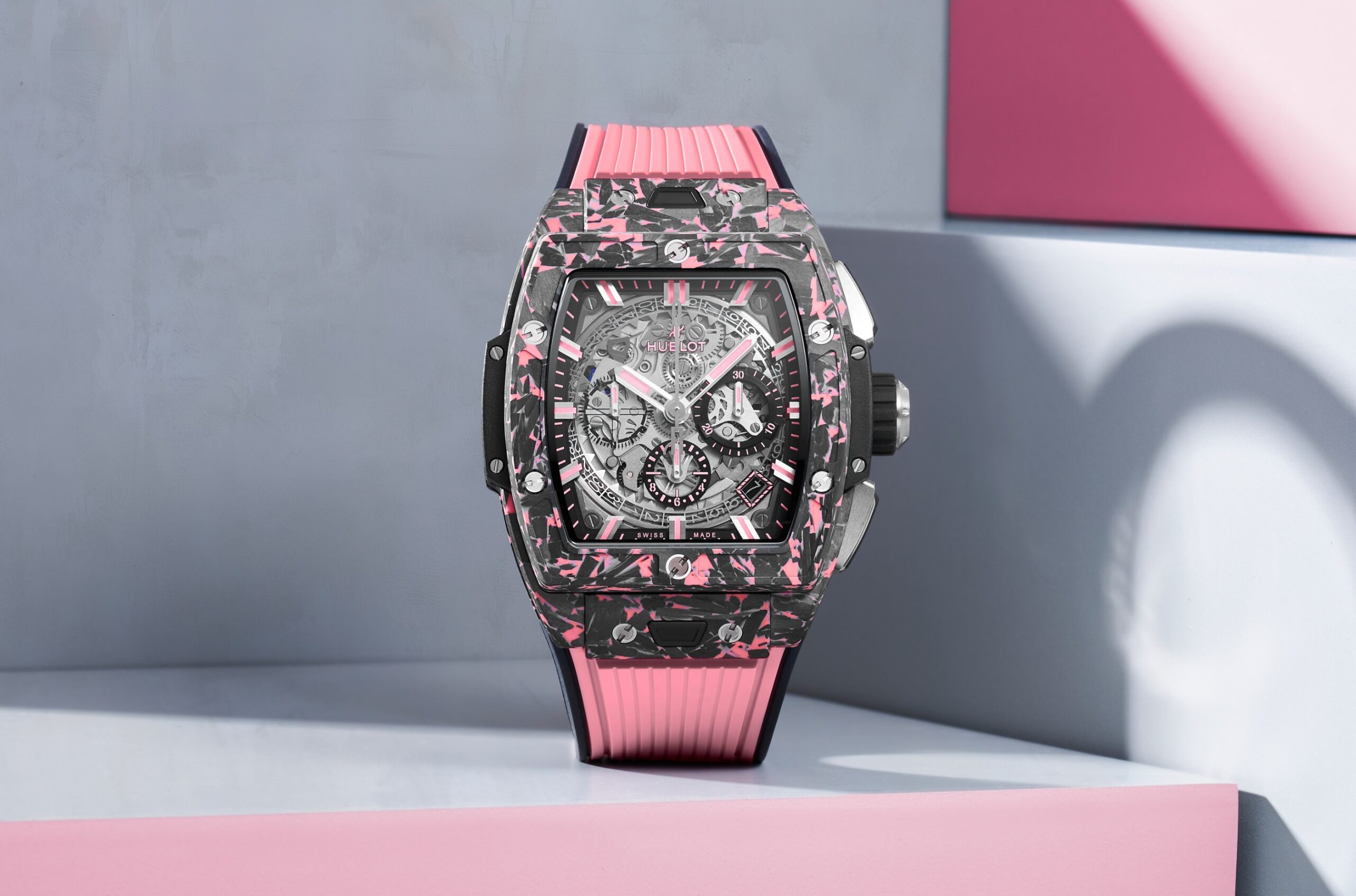 pirit of Big Bang Carbon Candy Pink từ Hublot sở hữu mặt số lộ cơ trong suốt như một sân khấu thu nhỏ, nơi bộ máy chronograph skeleton HUB4700 tự động hiện diện đầy sống động, dao động ở tần số cao 5Hz với 50 giờ dự trữ năng lượng. Với kích thước 42 mm, chiếc đồng hồ mang dáng tonneau cá tính, ôm gọn cổ tay nhưng vẫn đầy uy lực. Vỏ đồng hồ được chế tác từ carbon hồng sẫm dạng đá cẩm thạch, kết hợp chất liệu composite độc quyền tạo nên bề mặt frosted mờ ảo như phủ sương, mỗi chiếc là một cá thể độc nhất vô nhị. Các chi tiết như cọc số, kim chronograph hay logo đều khoác sắc hồng kẹo ngọt tươi tắn, làm nổi bật tinh thần trẻ trung và nổi loạn. Dây đeo bằng cao su dập vân có thể hoán đổi linh hoạt nhờ hệ thống One Click độc quyền, cho phép người đeo chuyển mình từ tinh thần thể thao cá tính sang phong cách thành thị hiện đại chỉ trong tích tắc.