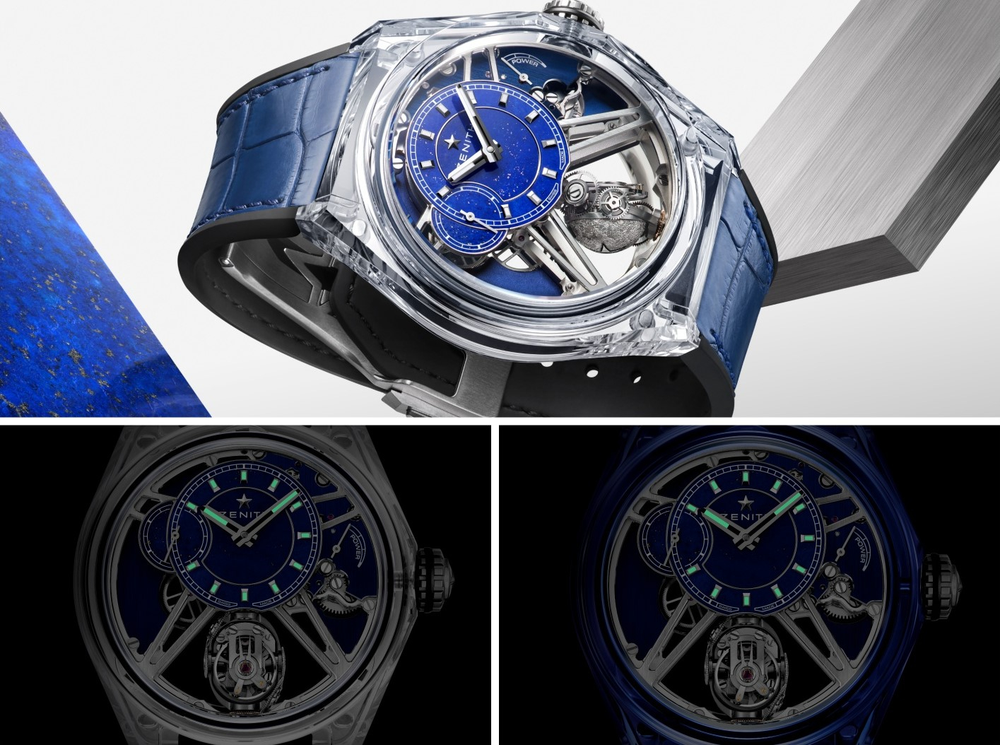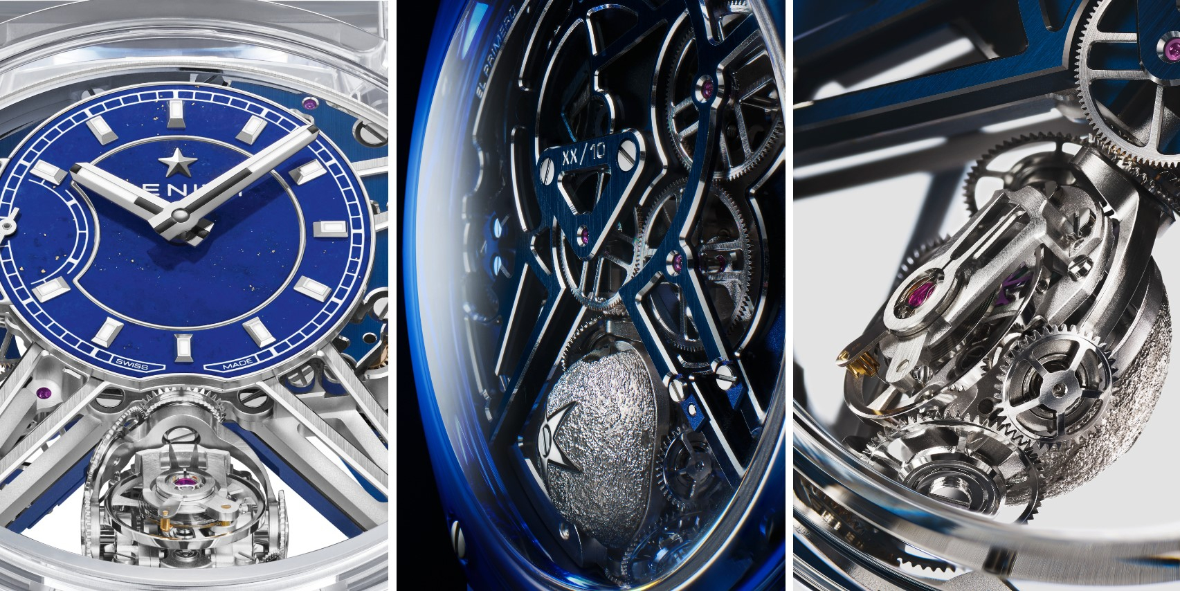 Mặt số lệch tâm hiển thị giờ, phút và giây nhỏ trên nền đá lapis lazuli xanh thẫm vân pyrit ánh vàng, gợi hình ảnh bầu trời đêm đầy sao; nhờ kết cấu tự nhiên, mỗi chiếc đều độc bản. Thang năng lượng dự trữ 50 giờ đặt tại vị trí 3 giờ. Calibre El Primero 8812S, bộ máy lên dây cót tay được thiết kế skeleton và hoàn thiện tương phản với hệ thống cầu thanh mảnh hình ngôi sao sáng màu, phô diễn trọn vẹn module Zero Gravity ở vị trí 6 giờ – liên tục xoay để giữ trạng thái cân bằng. Bộ thoát bằng silicon kết hợp neo hợp kim nickel – silicon, bánh răng sử dụng bộ điều chỉnh kép hình mũi tên đôi, gợi nhớ thiết kế của thợ đồng hồ Charles Fleck. Dao động ở tần số 5 Hz, “trái tim cơ học” đảm bảo độ chính xác cực cao, trong khi đối trọng của mô-đun mang hình ảnh thiên thể chạm khắc tinh tế.